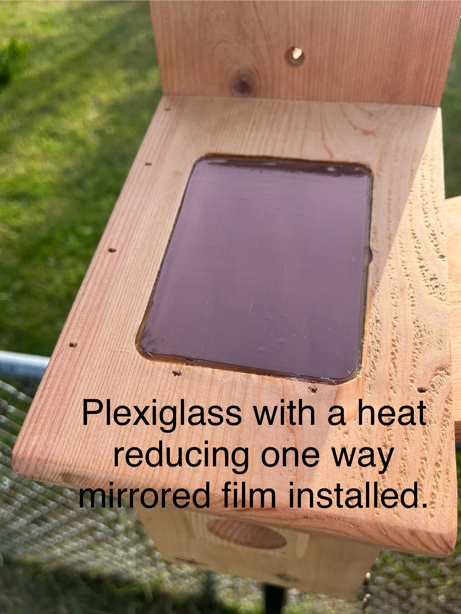 * Reflective tinted film. This heat reducing window film is designed for blocking out most solar rays by reflecting them away from the plexiglass, helping to keep the nesting box cooler during the hot summer days. The one way window film blocks out 95% UV rays and 81% infrared rays.